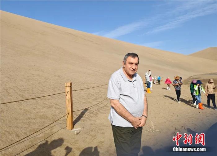 2023年9月6日,伊萨姆·沙拉夫在敦煌鸣沙山留影。崔白露 摄