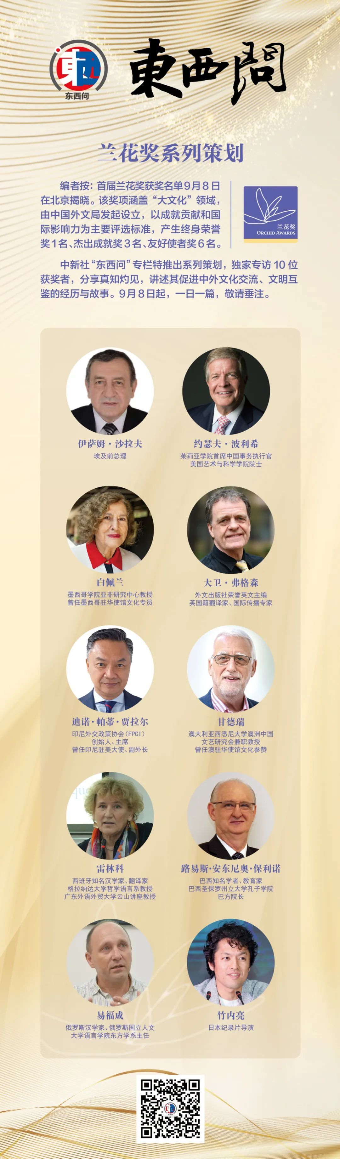 中新社“东西问”专栏特推出系列策划,独家专访10位获奖者,分享真知灼见,讲述其促进中外文化交流、文明互鉴的经历与故事。9月8日起,一日一篇,敬请垂注。