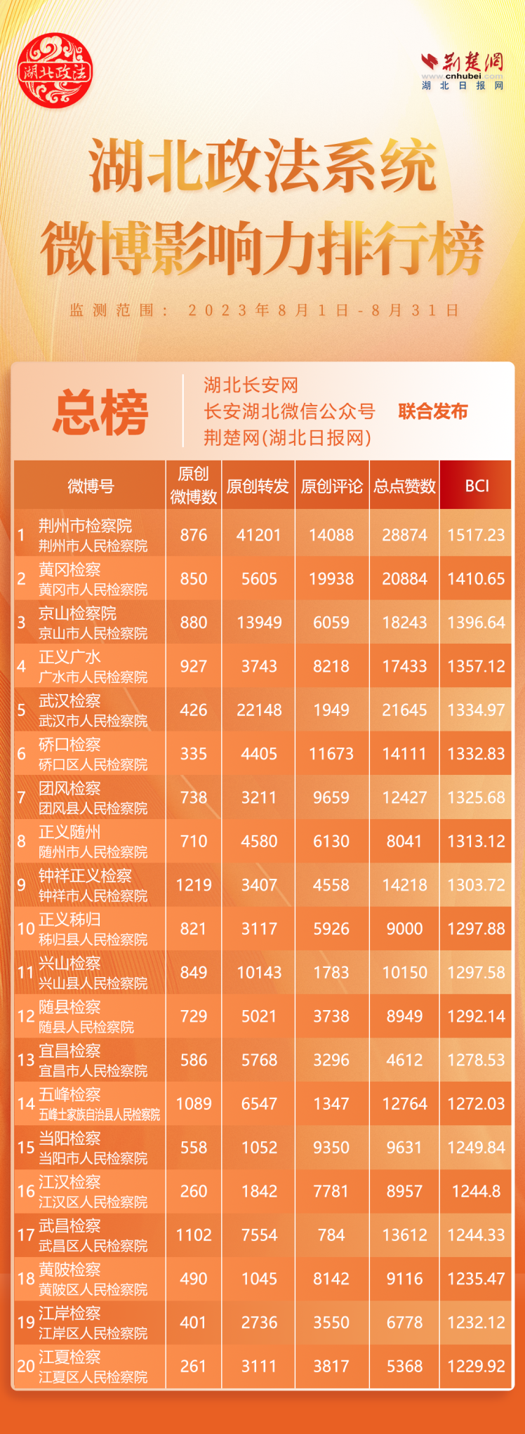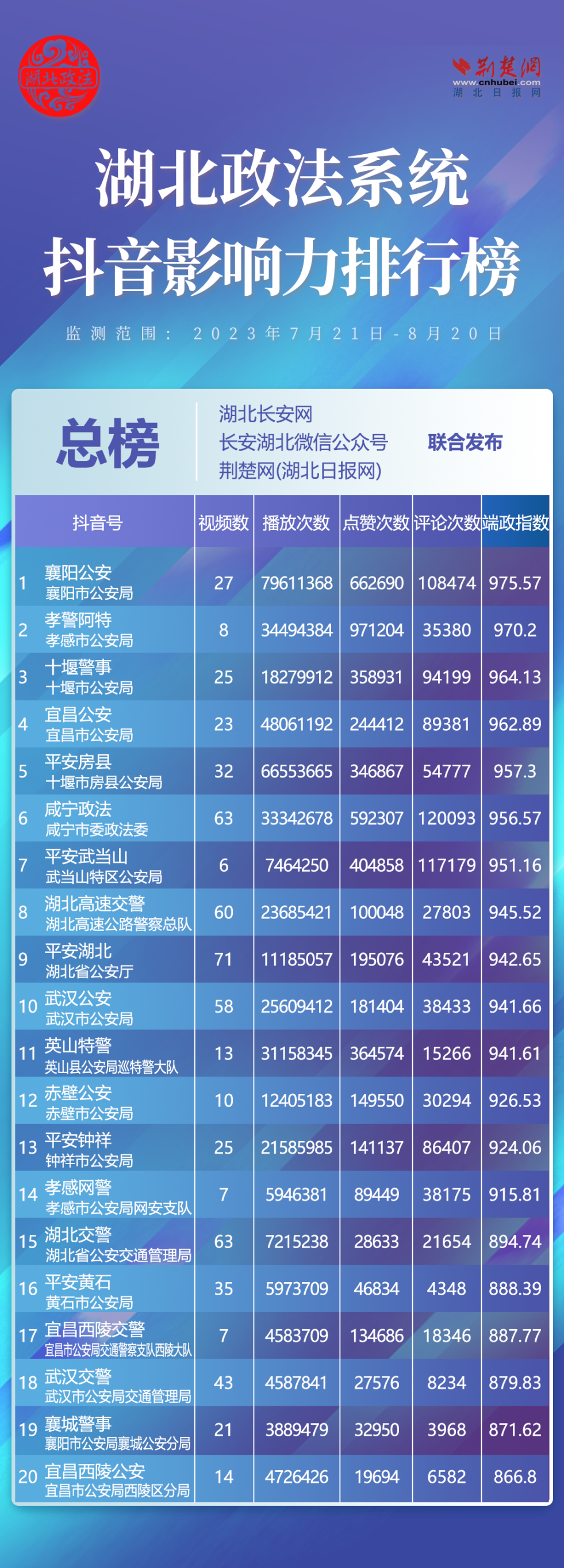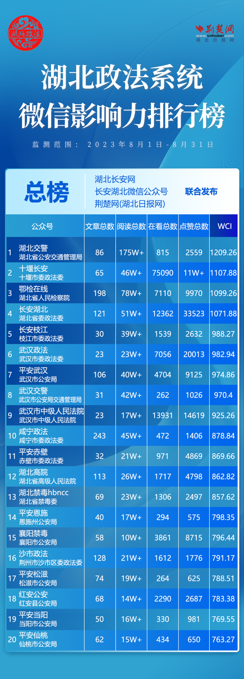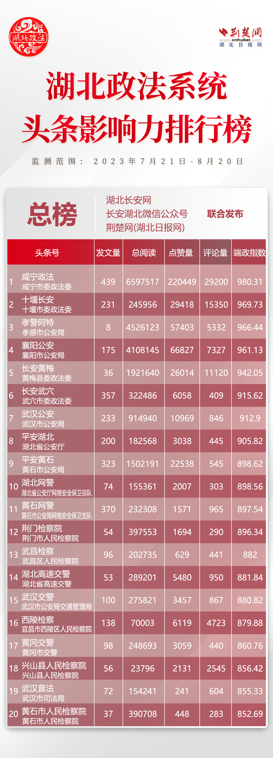 9月11日,湖北省委政法委官网湖北长安网、官微长安湖北,联合荆楚网(湖北日报网)、楚天舆情数据研究院发布湖北政法系统新媒体影响力排行8月榜单。具体榜单如下: