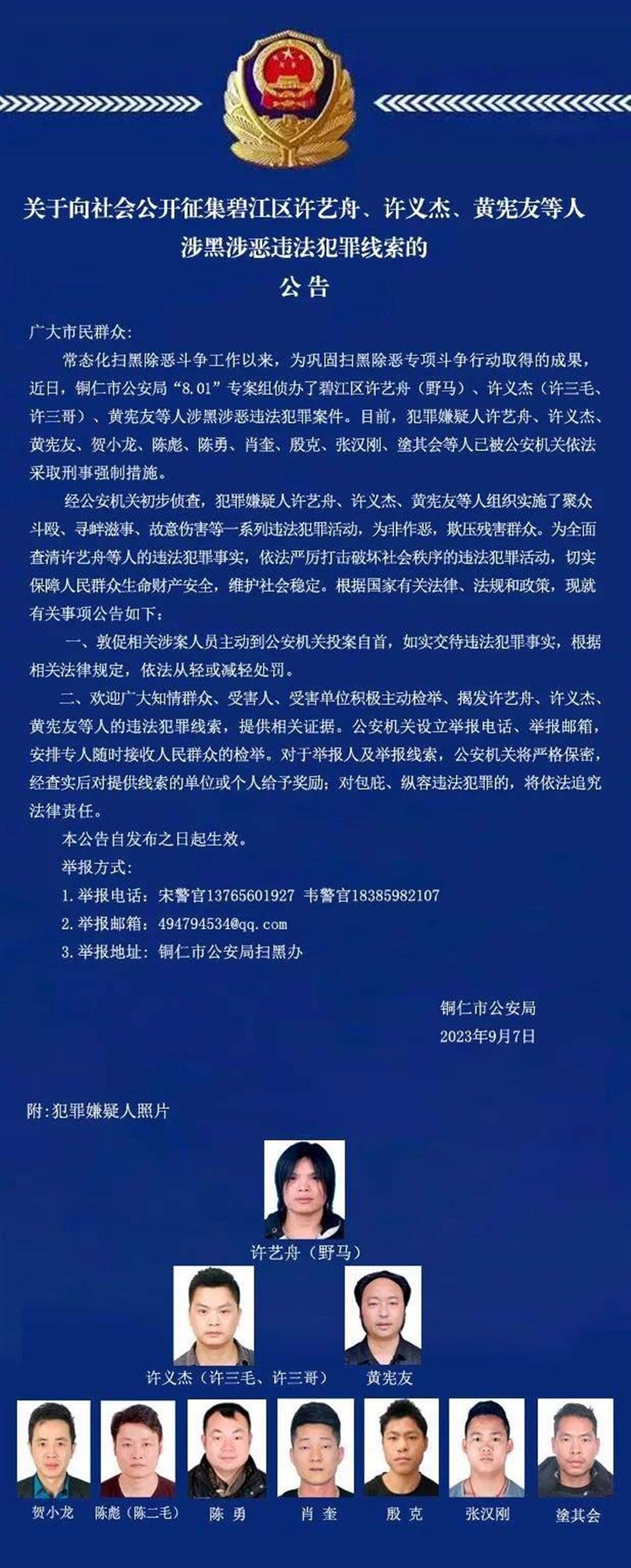 近日,贵州省铜仁市公安局发布公告,向社会公开征集网红歌手野马(本名:许艺舟)等人涉黑涉恶违法犯罪线索。经公安机关初步侦查,犯罪嫌疑人许艺舟、许义杰、黄宪友等人涉嫌组织实施了聚众斗殴、寻衅滋事、故意伤害等一系列违法犯罪活动,为非作恶,欺压残害群众。(据9月11日央广网)