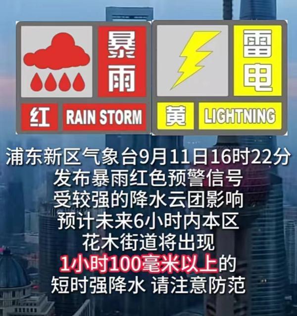 预警发布情况:上海中心气象台于14时07分发布雷电黄色预警信号;16时02更新暴雨蓝色预警信号为暴雨黄色预警信号。浦东新区气象台16时22分更新该区域暴雨橙色预警信号为暴雨红色预警信号。
