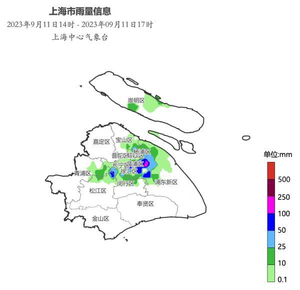 雨情通报:午后的强对流范围不大,但强度大。统计14时至17时的降雨量,1个街镇超过100.0毫米,7个街镇超过50.0毫米,其中浦东花木街道105.0毫米为最大,1小时雨量最大出现在浦东花木街道102.1毫米(09月11日15时36分~09月11日16时36分)。