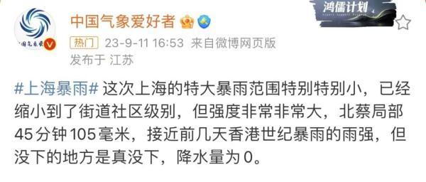 科学博主@中国气象爱好者 表示:这次上海的特大暴雨范围特别特别小,但强度非常非常大,北蔡局部45分钟105毫米,接近前几天香港世纪暴雨的雨强,但没下的地方是真没下,降水量为0。