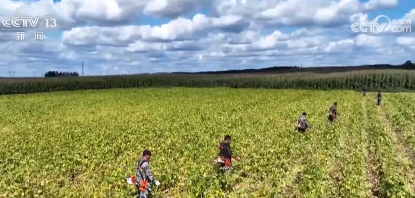 9月9日,记者来到辽宁铁岭开原市,在山间坡地上,种植户们手持背负式小型收割机在豆田中来回穿梭作业,一株株黄绿色的豆秆整齐地倒在田埂上。
