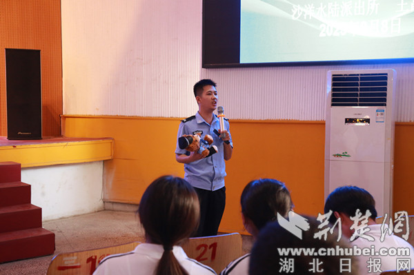 荆楚网(湖北日报网)讯(通讯员 黄翔)“答对问题即可获得警察小熊玩偶!”9月11日,沙洋县后港中学举行秋季学期法治教育讲座,沙洋县公安局沙洋水陆派出所民警进行讲授,民警手中的“警察小熊”为课堂增添活跃气氛,同学们纷纷举手互动。