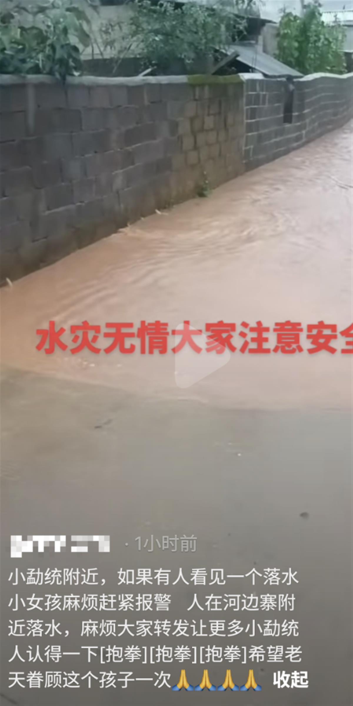 9月13日,多位网友发布视频图文称,当天上午,云南省临沧市永德县小勐统镇一名女童被洪水冲走,下落不明。据新京报我们视频报道,小勐统镇麻栎树村村民称,村里一名小女孩上学路上被洪水冲走,截至下午1时未找到。
