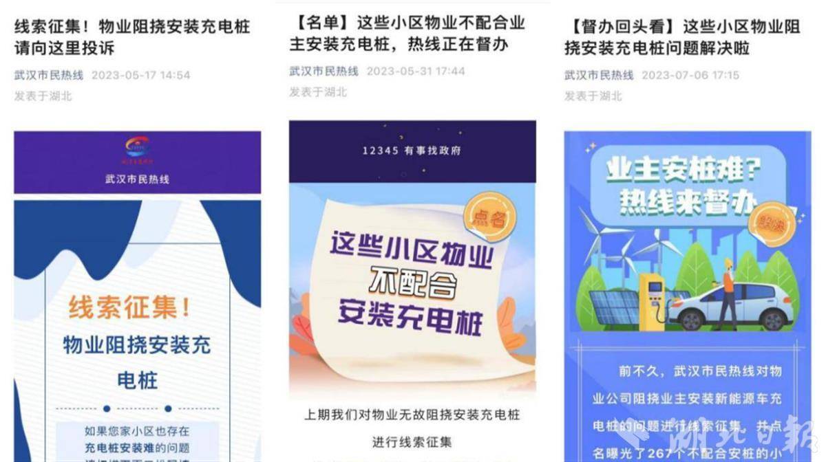有市民反映,部分物业公司阻挠个人安装电动车充电桩。武汉市民服务热线在督办时发现此类问题反映较为强烈,主动对同类问题进行梳理分析,并进行线索征集。点名曝光267个小区物业后,过半物业公司进行了整改,部分物业公司承诺整改。