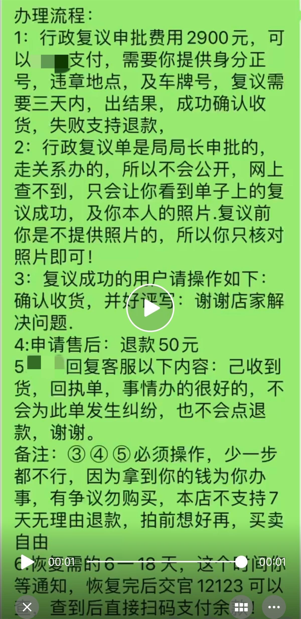 极目新闻记者看到,视频是由两张图组成,第一张图写着“醉驾@酒驾”,第二张图内容较长,详细写明了办理流程:“行政复议审批费用2900元……行政复议单是局长审批的,走关系办的,所以不会公开,网上查不到……复议成功的用户请操作如下:确认收货,并写好了评:谢谢店家解决问题。申请售后50元,回复客服:已收到货,回执单,事情办得很好,不会为此单发生纠纷,也不会点退款……”