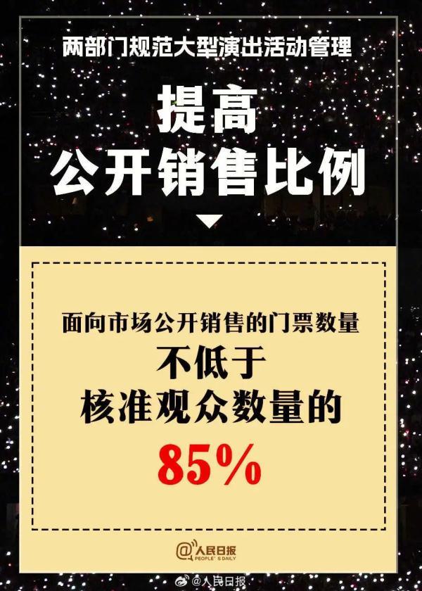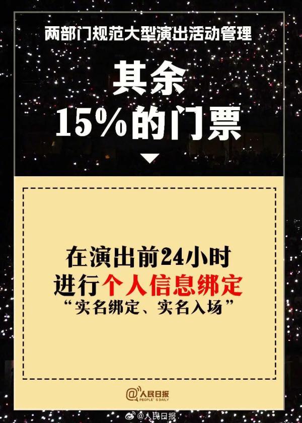 其中最抓眼球的一条,就是——“演出举办单位公开销售的门票数量,不得低于核准观众数量的85%;对其余15%的门票,应当在演出前24小时进行个人信息绑定,做到‘实名绑定、实名入场’。”