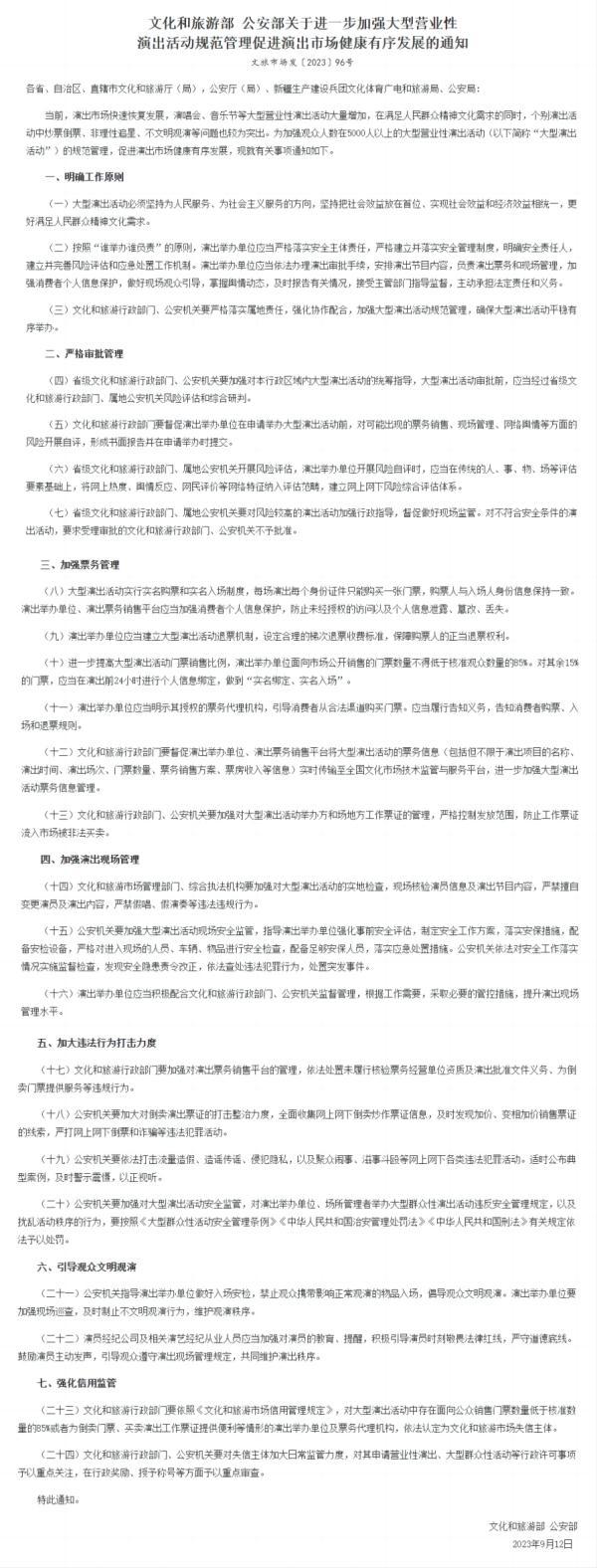 9月13日,文化和旅游部在其官网发布了名为《文化和旅游部 公安部关于进一步加强大型营业性演出活动规范管理促进演出市场健康有序发展的通知》(以下简称《通知》)一文。