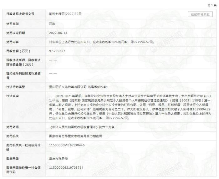 此前,据信用中国网站显示,2022年6月13日,袁冰妍关联公司重庆丽妍文化传媒有限公司因逃避缴纳税款被罚97.8万元。在被曝光后,2022年7月4日,袁冰妍工作室发布声明称,关于税务机关对重庆丽妍文化传媒有限公司作出的处罚,公司深刻反省,并积极配合整改。