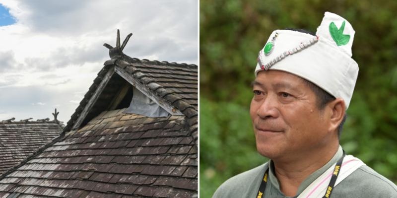 (左图)在芒景村翁基寨当地布朗族的传统建筑屋脊上装饰有“一芽两叶”标识(2023年8月29日摄)。新华社记者李贺 摄