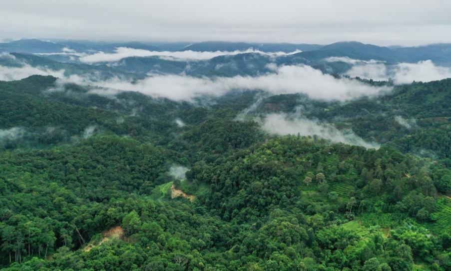拥有独特地理和气候环境的景迈山古茶林被云气缭绕恍如“世外桃源”(无人机照片,2023年8月30日摄)。新华社记者李贺 摄
