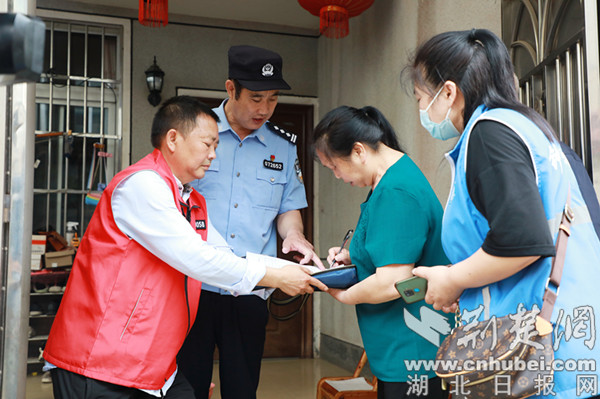 莫愁义警协助民警开展入户反诈宣传。通讯员供图