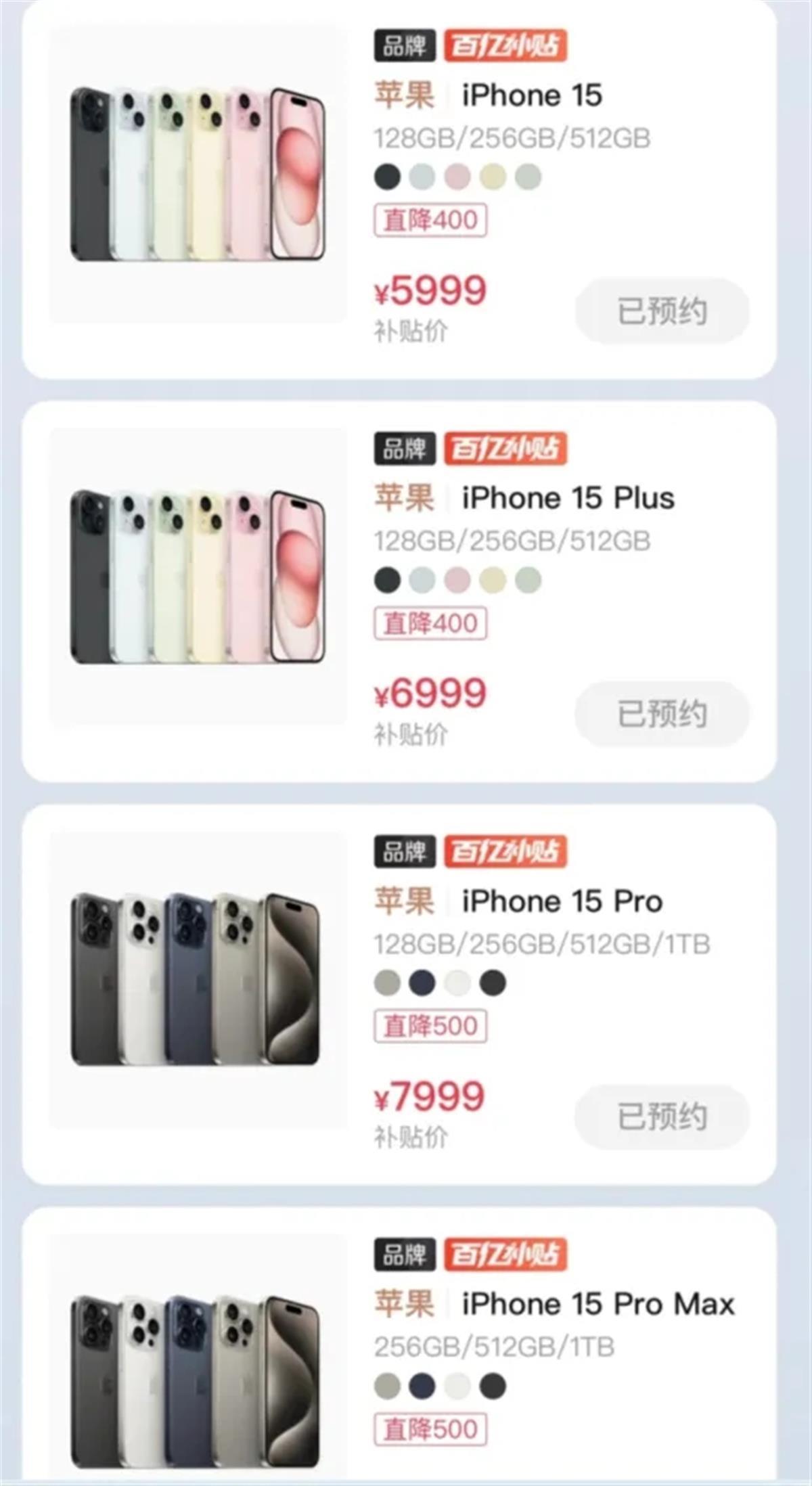 从一机难求到需求低迷,iPhone不“香”了?极目新闻记者随后登录京东、淘宝、拼多多等电商平台看到,目前,iPhone 15系列机型均开启了预售。在淘宝百亿补贴专区,iPhone 15和iPhone 15 Plus等部分机型,可享5元补贴,换新补贴最高500元;京东推出以旧换新至高补贴680元优惠;拼多多补贴力度相对较大,iPhone 15系列机型全系列最高首发直降500元。