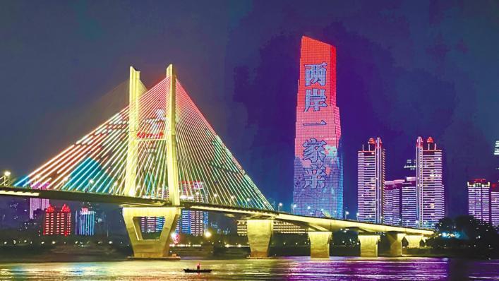 9月18日晚,武汉两江四岸桥梁楼宇点亮“台湾周”主题灯光秀。“两岸一家亲”“共叙鄂台情”“同心共筑中国梦”等主题字样滚动播放。(湖北日报全媒记者 李溪 摄)