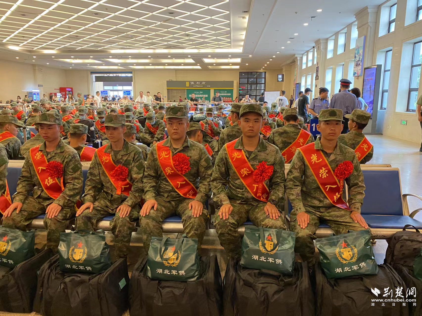 荆楚网(湖北日报网)讯(通讯员吴寅 杨晏清)9月16日,湖北省2023年下半年首批新兵出征仪式在汉口火车站举行。来自湖北省军地部门的代表、应征入伍新兵的家长代表等,来到现场欢送新兵们启程奔赴军营。在汉口火车站候车室,一百余名入伍新兵胸戴大红花,精神抖擞、整装待发,准备搭乘高铁奔赴军营。