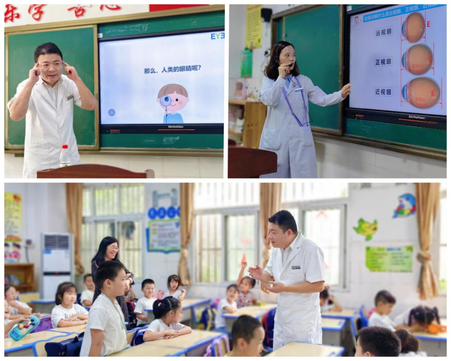 武汉爱尔眼科洪山医院视光科王智琦主任、斜视与小儿眼科周伟医生分别为一年级两个班的同学们生动形象地讲解了眼睛的发育过程、成像原理以及近视发生的成因等知识内容,介绍了在日常生活中普遍存在的不良用眼习惯以及近视对学习生活的影响,并针对儿童青少年应该如何保持健康视力、做好近视管理的问题给出了指导建议。这些深入浅出、通俗易懂的科普讲解得到了孩子们热情的参与。