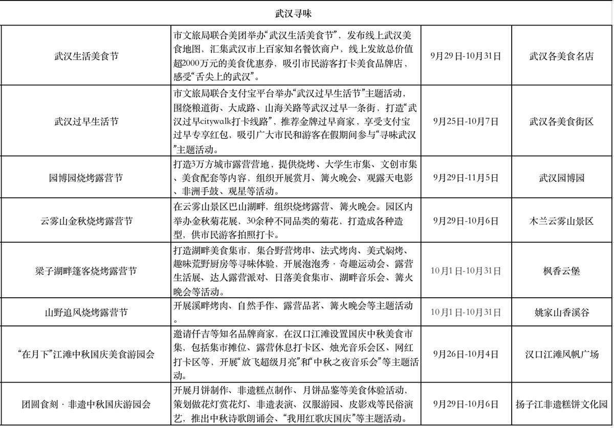 “武汉寻味”板块,以营地烧烤、过早宵夜、月饼制作、传统美食等体验活动为主打。联合支付宝举办“武汉过早生活节”,推出“武汉过早漫游打卡线路”,发布支付宝“过早专享红包”,引导市民、游客“寻味武汉”,品尝传统美食、美味。联合美团举办“武汉生活美食节”,推出“寻味大武汉”线上美食地图,发放美食优惠券,吸引市民游客打卡品牌店,感受“舌尖上的武汉”。另外,在汉口江滩还将举办“在月下”国庆中秋美食游园会,设置美食市集、露营打卡、烛光音乐等体验区,举办“超级月亮”放飞、中秋月下品茗会等特色活动。