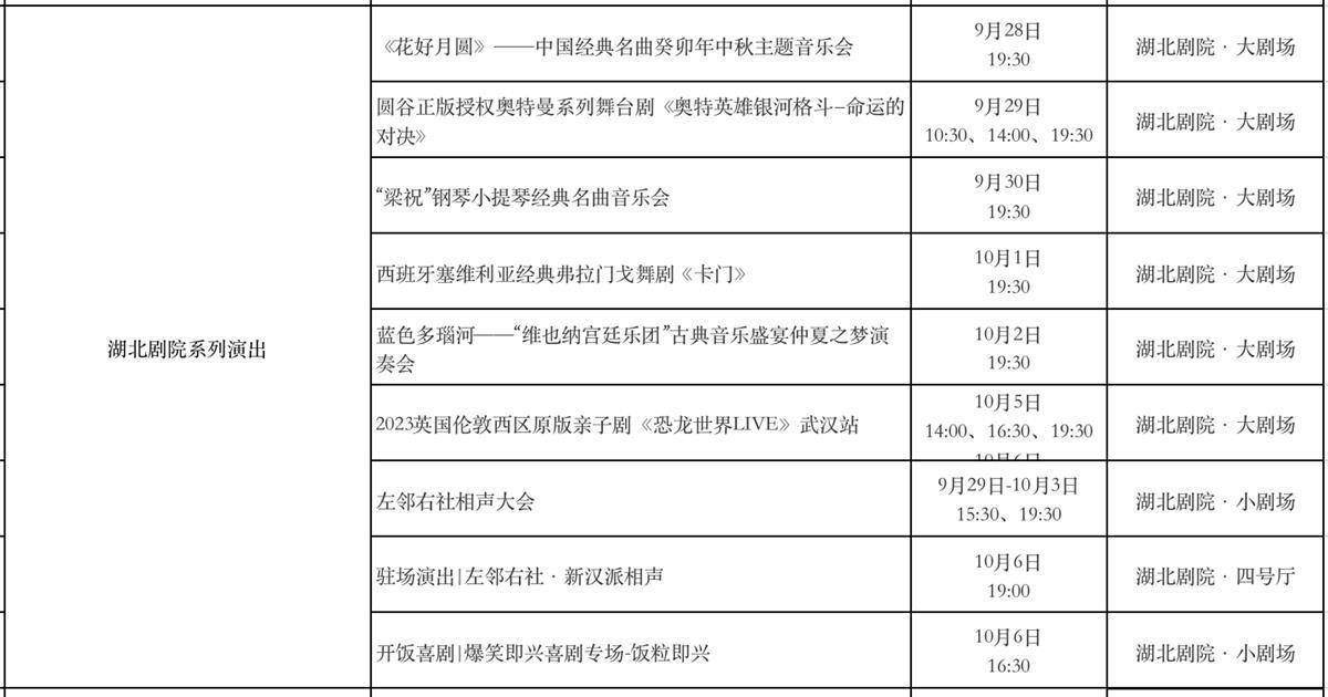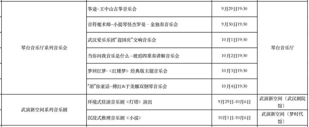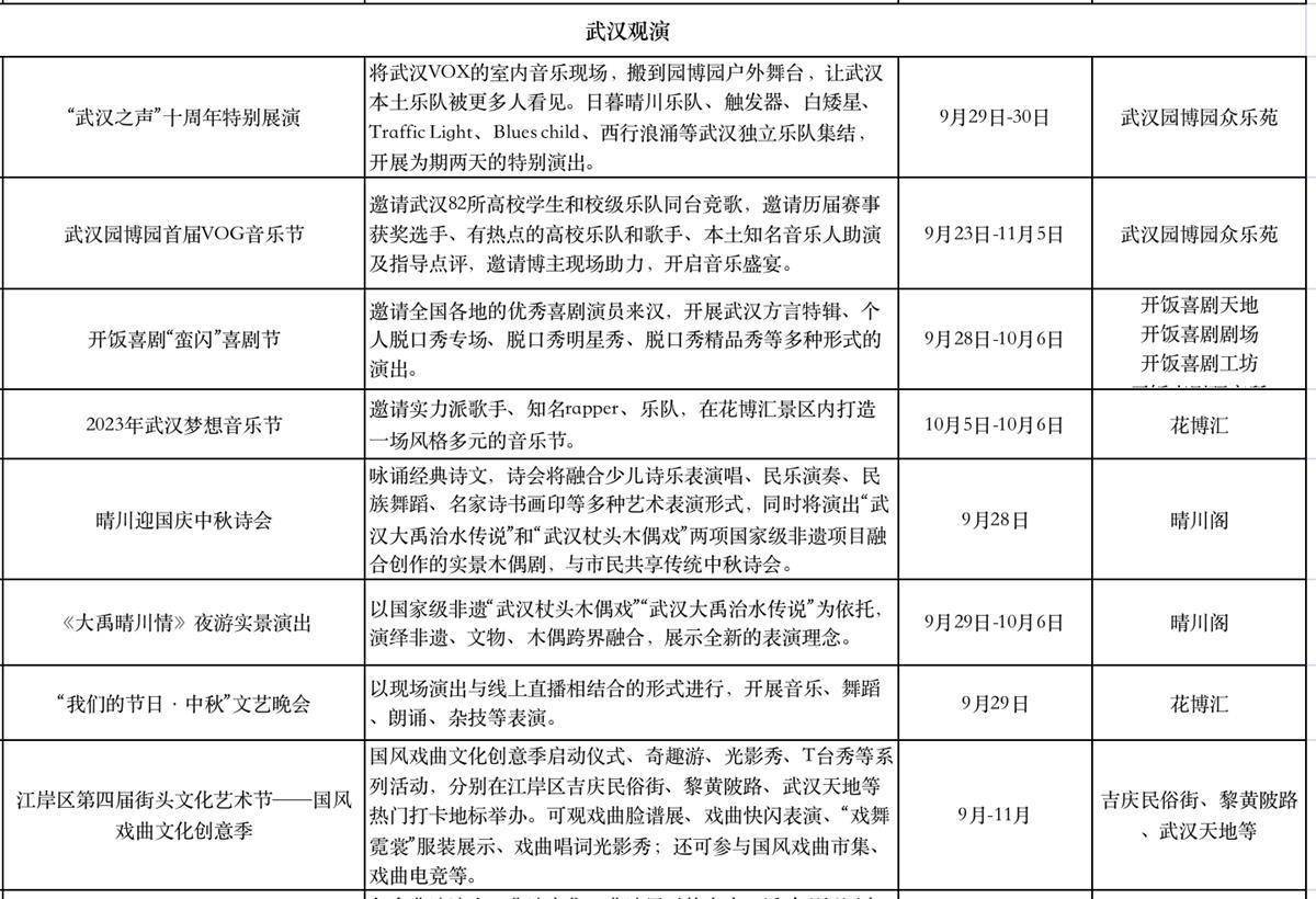 “武汉观演”板块,以音乐节、开饭喜剧、城市剧场、沉浸式演艺为主打,主要包括“武汉之声”十周年特别展演、开饭喜剧“蛮闪”喜剧节、园博园大学生音乐节、花博汇武汉梦想音乐节等演出活动,“我们的节日·中秋”文艺晚会、“花好月圆”中秋音乐会、武汉爱乐乐团“迎国庆”交响音乐会等专场汇演,以及盘龙城遗址博物院的环境舞蹈剧场《城之根》,晴川阁的《大禹晴川情》夜游实景演出等沉浸式演出,为市民游客奉上精彩纷呈的文化盛宴。