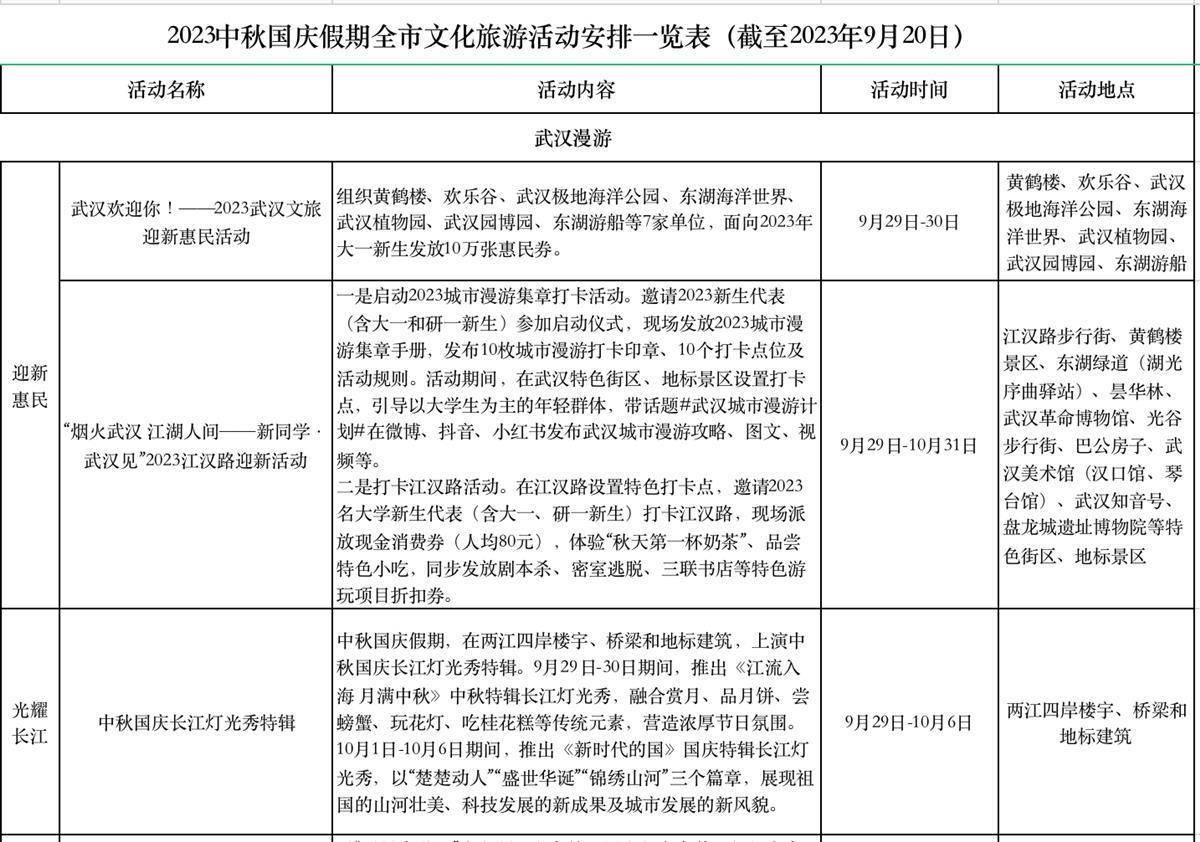 中秋国庆假期,武汉将发放3000万元文旅消费券,市民、游客可通过美团、携程、抖音、文惠通、文旅码等平台抢券,到全市450余家文旅商户消费,享受政府财政补贴7折优惠。“2023武汉文旅迎新惠民活动”送出10万张惠民券,邀请大一新生免费游览武汉七大经典景区。同时,市文旅局联合美团、支付宝等平台,举办“武汉生活美食节”“武汉过早生活节”等美食体验活动,其中,支付宝平台投放30万元过早专享现金红包,美团联合上百余家品牌商家发放超2000万元美食优惠打折券,让市民、游客享受假日福利,尽情品尝汉派美食。