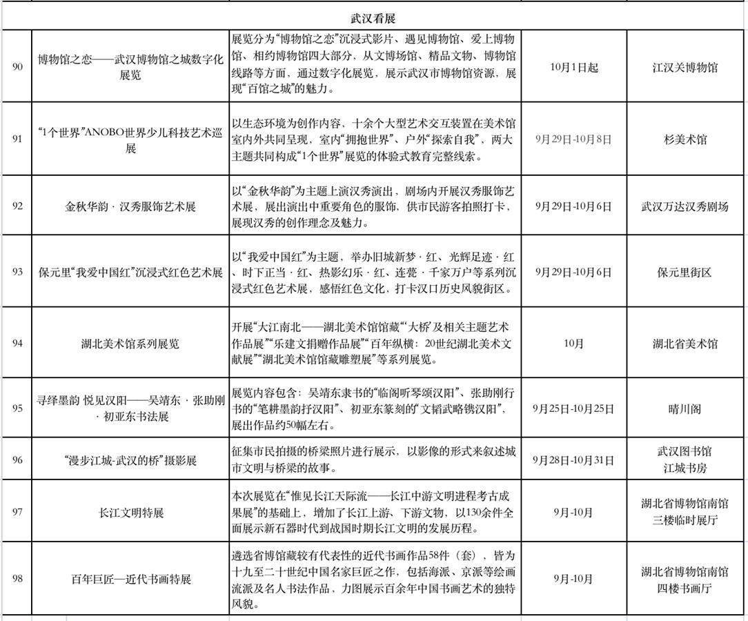 “武汉看展”板块,以数字展览、艺术展示、书法摄影展等展陈活动为主打,包括江汉关博物馆“博物馆之恋——武汉博物馆之城数字化展览”,世界少儿科技艺术巡展、武汉图书馆“漫步江城-武汉的桥”摄影展,以及汉秀剧场“金秋华韵·汉秀服装美陈展”、晴川阁名家书法展等,不断丰富市民游客假日精神文化生活。