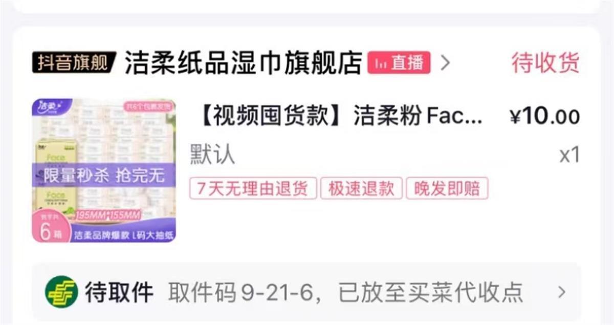 9月21日,一位网友告诉极目新闻记者,9月19日,他通过QQ上的“薅羊毛群”看到了洁柔官方旗舰店“10元6箱”的链接,他也猜测商家是标错价格了。因为觉得便宜,他就下了一单,“群里买到的人很少,这个链接只持续了三四分钟就下架了。”