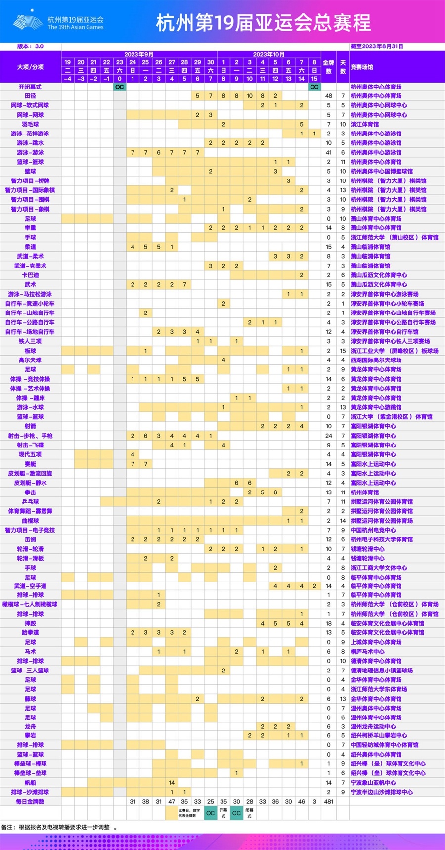 本届杭州亚运会共设置40个大项、61个分项、481个小项。板球、足球、排球等项目将在开幕式前率先打响。9月24日是开幕式后首个比赛日,首金也将在该日诞生。