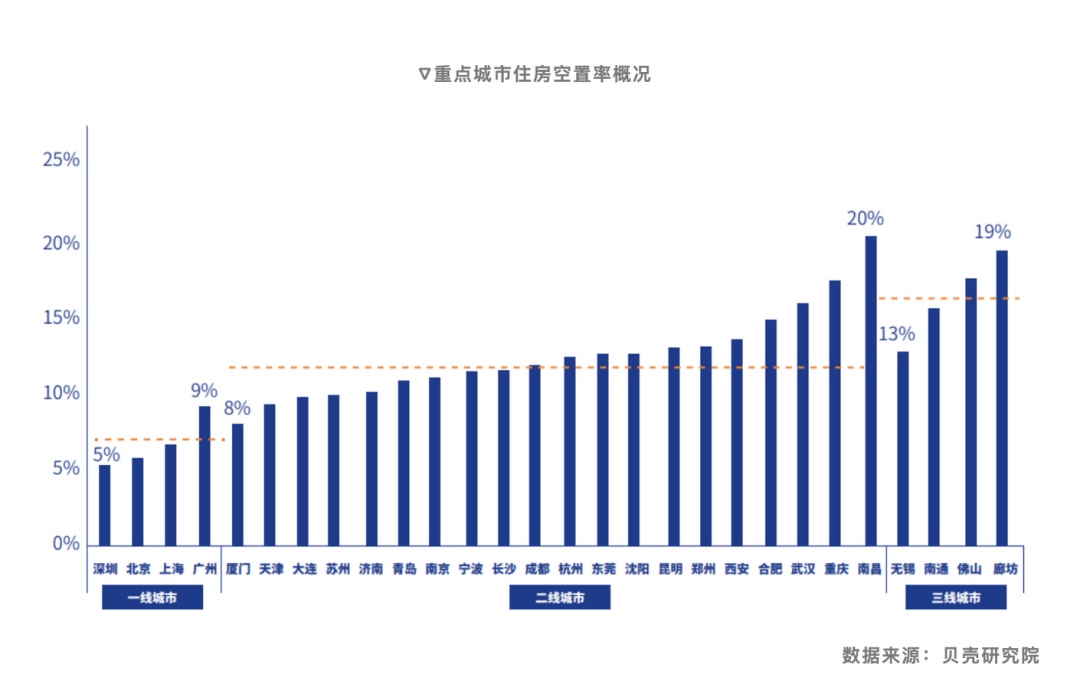 贝壳报告称,对其业务范围内的小区摸底调研,将3个月以上无人居住的住房定义为“空置住房”,设定空置户数/总户数即为城市住房空置率。报告显示,我国28个大中城市平均住房空置率为12%,相对处于较高区间。