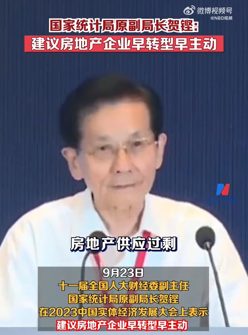据媒体报道,9月23日,十一届全国人大财经委副主任,国家统计局原副局长贺铿在2023中国实体经济发展大会上表示,“现在房地产供应过剩,空置的房屋究竟有多少,各个专家估出来的数字相差很大,14亿人可能住不完。这么多空置房子再要大力发展房地产是不明智的,所以在这种情况之下,房地产企业必须转型,早转型早主动。”