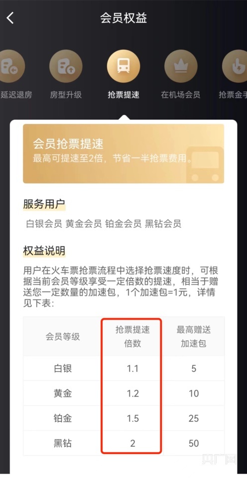 记者发现,在另一个第三方购票平台,会员分为普通、白银、黄金、铂金、黑钻等不同等级,不同等级享受不同权益。从抢票提速这一权益来看,普通会员并未享受抢票提速这一权益,而白银到黑钻会员的抢票速度则依次提高1.1倍、1.2倍、1.5倍、2倍。