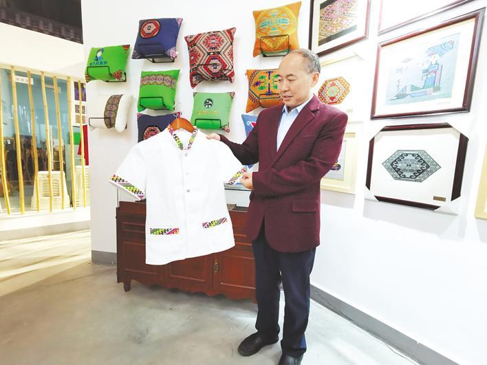 湖北民族大学教授李军展示一件带有西兰卡普元素的服饰。 (湖北日报全媒记者 张歆 摄)