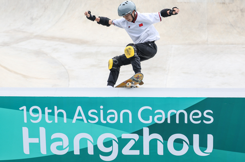 9月25日,杭州亚运会滑板男子碗池决赛,15岁中国少年陈烨摘金。