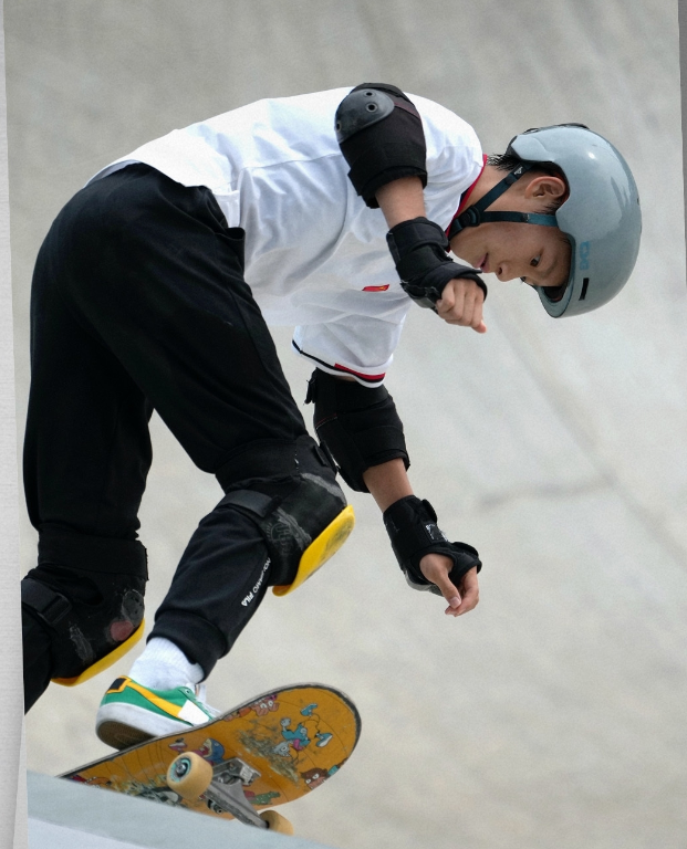 “我爸不会玩滑板,但从小都是他教我,他会研究国外的滑板视频,摸索着指导我。”陈烨老家在广东中山,当时那里的滑板氛围并不浓厚。于是,父子俩出现在香港、东京等地的街头,去观摩其他滑手的动作。在陈烨从街式转到碗池后(滑板比赛分为碗池和街式两个项目),陈玩钦甚至耗时半年为儿子打造了一个碗池用以训练。父子俩在这条路上越走越远,直到2019年陈烨被选入广东队,先后在全国锦标赛、全运会上夺得奖牌,2022年获得国家集训队选拔赛冠军,一步步走到了亚运会最高领奖台。