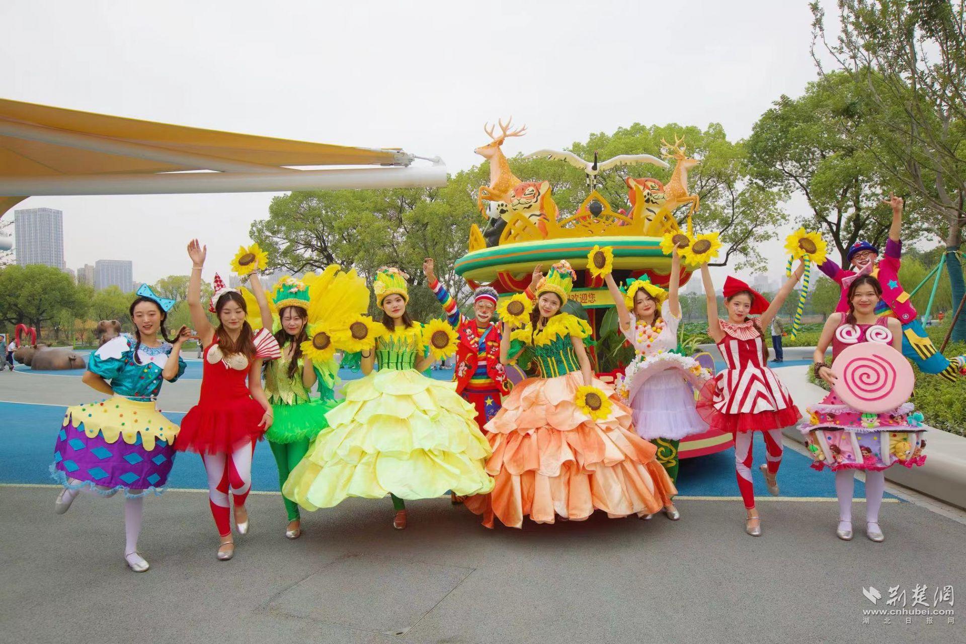 28日上午,武汉动物园的开园仪式现场,一派童趣盎然:巨型大熊猫、非洲象气球“爬”到了建筑上;装扮成花仙子的演员们,随花车一起翩然巡游;老虎、企鹅等动物造型的人偶,与游客们热情互动;与此同时,滨水广场上的一组动物雕塑萌趣十足,“河马”圆润可爱、“乌龟”伸着脑袋、“鳄鱼”表情憨厚……