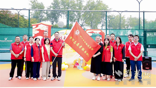 五福社区党委书记乔飞向湖北商贸物流集团护河志愿队授旗。通讯员供图