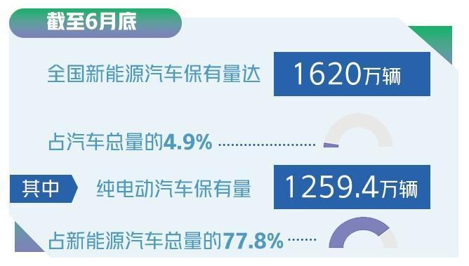 公安部发布的数据显示,截至6月底,全国新能源汽车保有量达1620万辆,占汽车总量的4.9%。其中,纯电动汽车保有量1259.4万辆,占新能源汽车总量的77.8%。上半年新注册登记新能源汽车312.8万辆,同比增长41.6%,创历史新高。新能源汽车新注册登记量占汽车新注册登记量的26.6%。