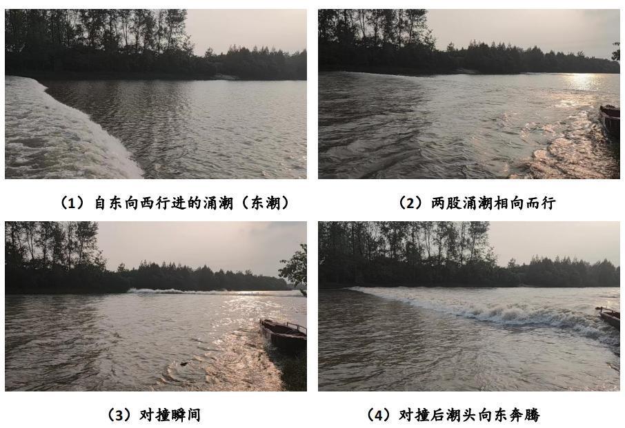 2023年科考发现交叉潮出现了新变化,从形态看,潮水在交叉后呈现出两个“V”字,而且处在动态的变化中。交叉之后,两股潮水继续行进,而中间的一股潮水呈现向前奔涌的态势,实属罕见。