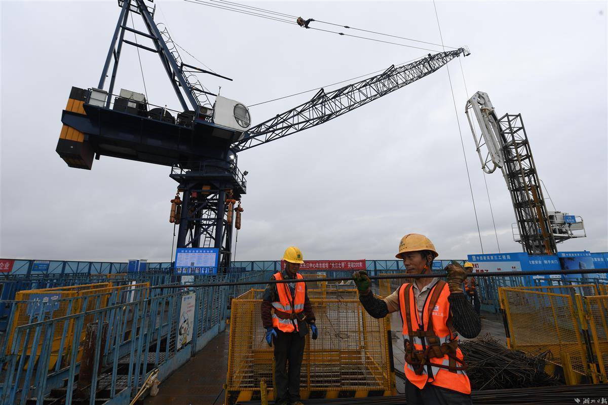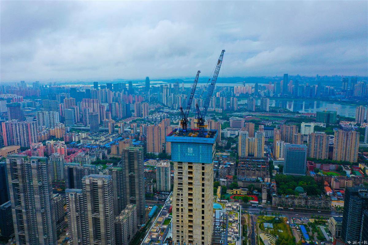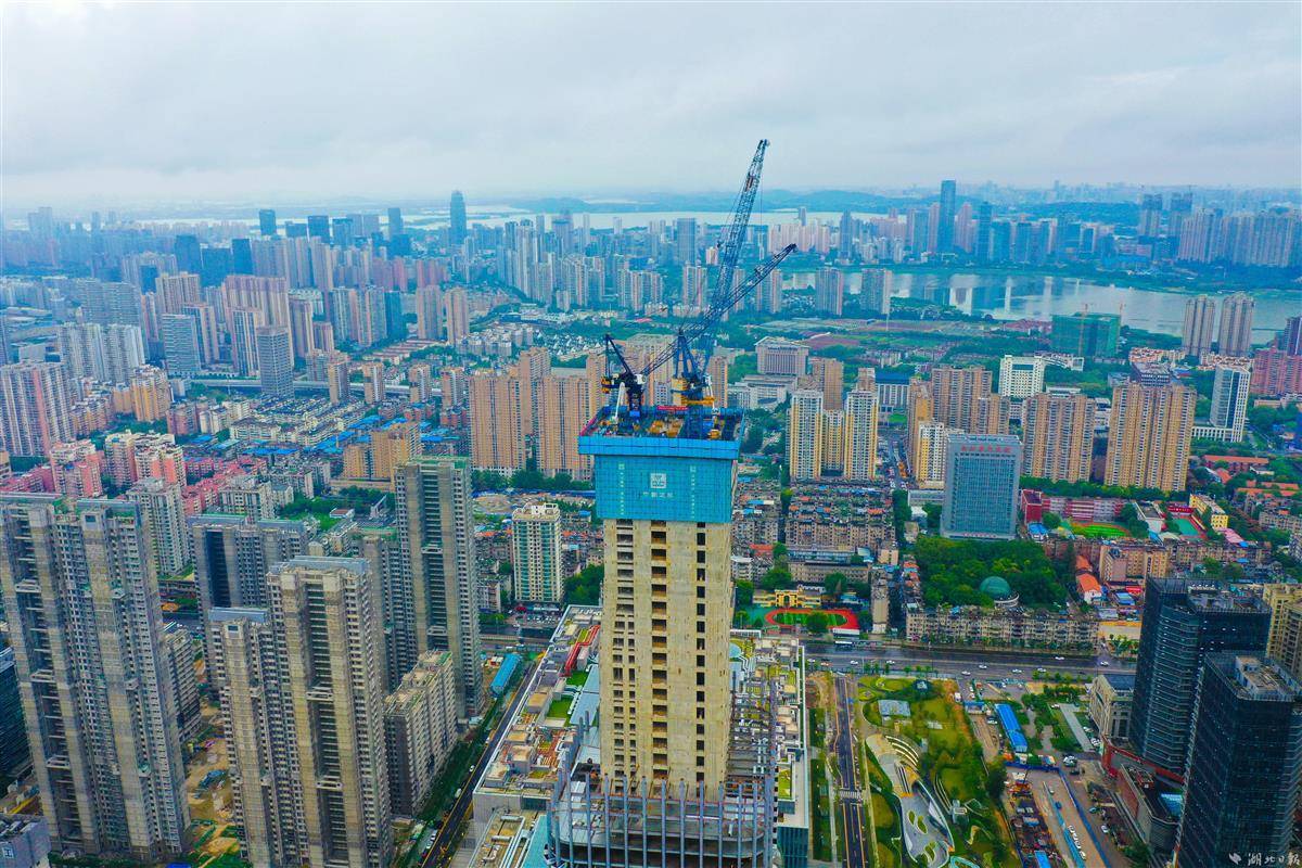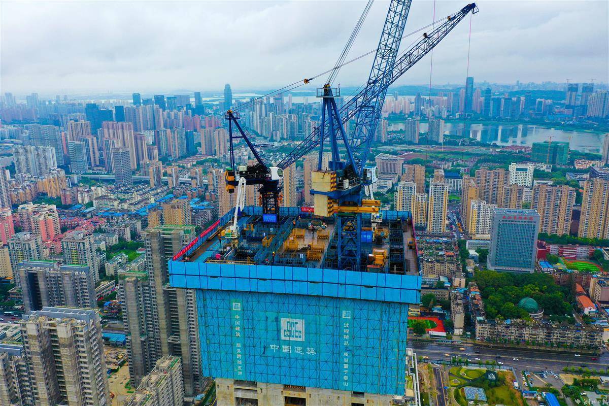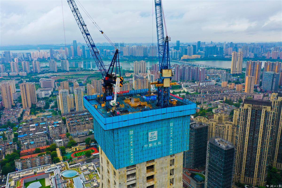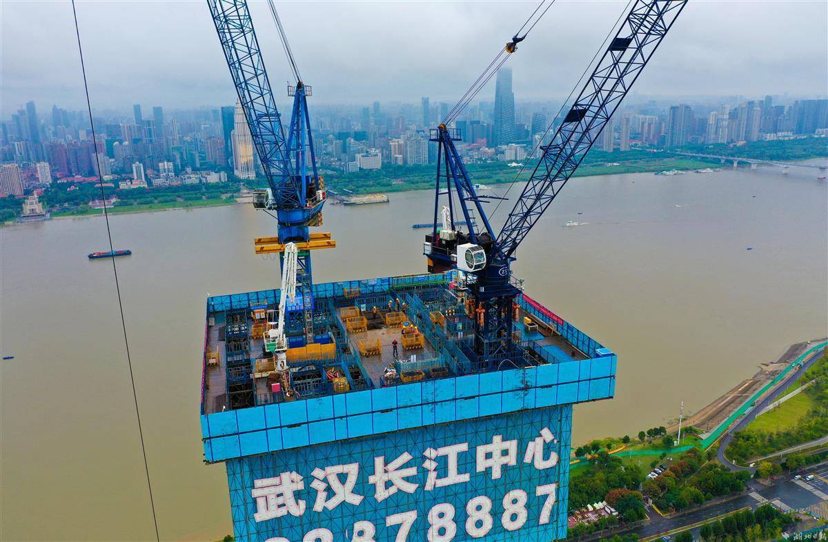9月30日,武汉长江中心建设现场,中建三局200余名建设者在空中造楼机内3个作业层加紧施工,冲刺300米节点。
