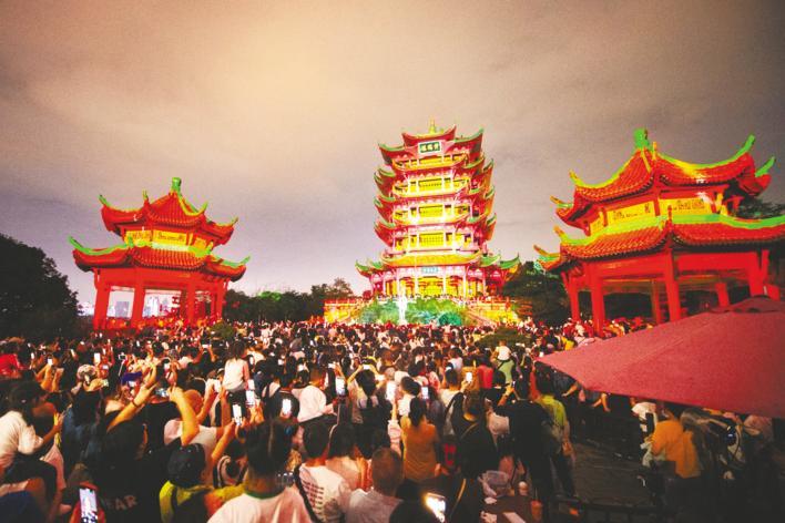 9月30日晚,夜上黄鹤楼特别推出“月圆中秋”活动,大批游客走进黄鹤楼,高举相机记录下绚烂的楼体灯光秀。(湖北日报全媒记者 何宇欣 通讯员 李博 摄)