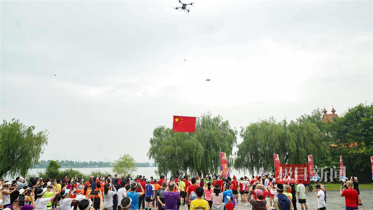 鲜艳夺目的红旗与东湖的秀美山水交相辉映,这震撼的场景引起现场市民游客的一片欢呼,“感受到科技力量和对祖国美好的祝福。祝愿我们的祖国更加富强、美丽,人们生活越来越美好。”