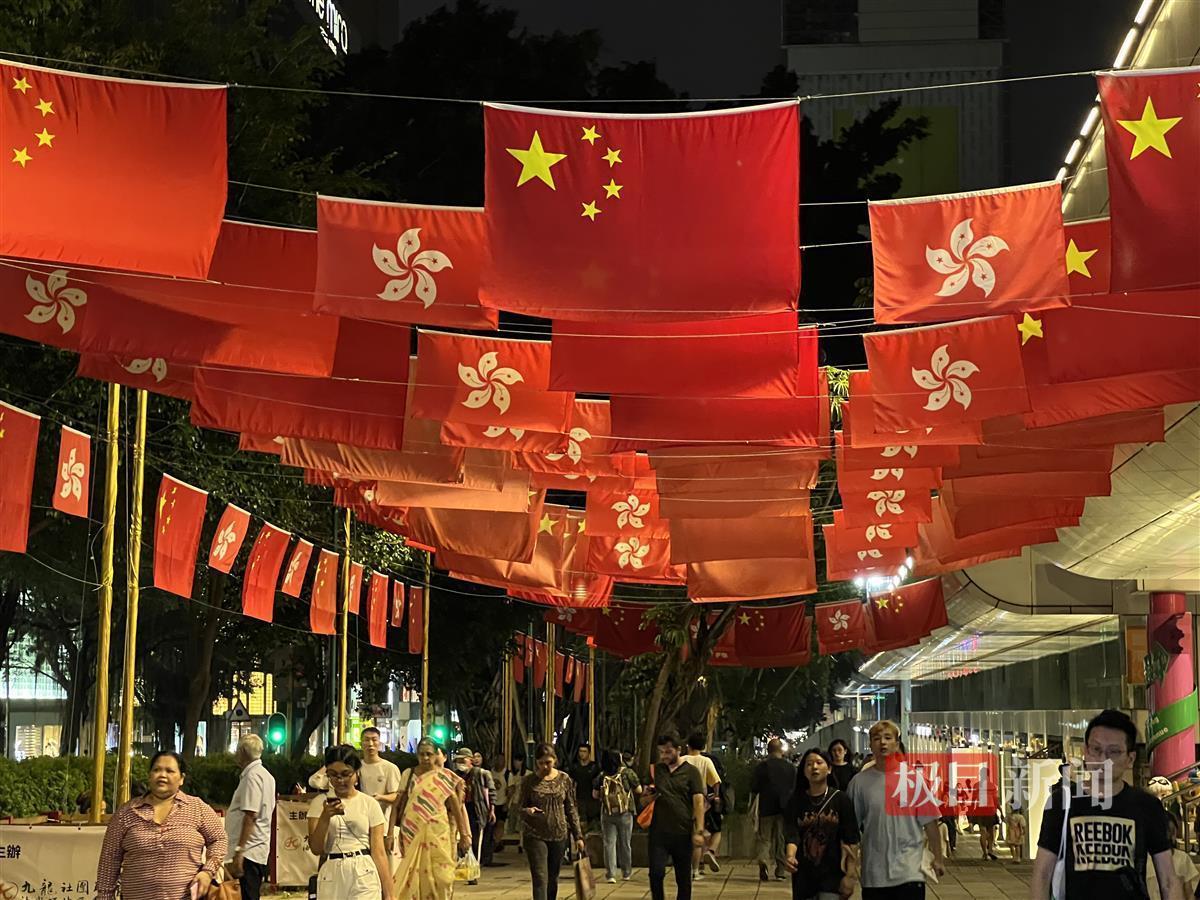 极目新闻记者在港岛湾仔区、九龙城区等地走访看到,商场大厦、文化场馆、公园学校、公交马路、街道灯柱等大都飘扬起“中国红”,写着“庆祝中华人民共和国成立74周年”的海报以及五星红旗、红灯笼随处可见。
