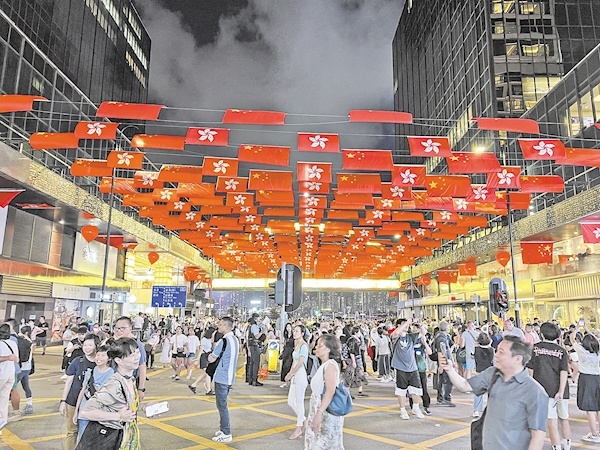 记者漫步在港岛湾仔区、九龙城区等地,满眼都是“中国红”,五星红旗、红灯笼和“庆祝中华人民共和国成立74周年”的海报随处可见。