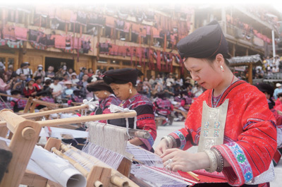 走在村里,村民将自织自染的布晾晒在窗外,织布、染布、刺绣皆在窗前。红瑶人家对红色情有独钟,大部分都传承了自织自染自绣自制的传统手艺,这一习俗延续至今。“染色使用的是秋季收获的枫树汁,树汁煮过后成为蜡。用蜡先在白布上绘图,然后将白布投入染缸上色,上色后的布料经水洗再晾晒,如此反复染色、晾晒多次使布料固色。”潘继凤说。