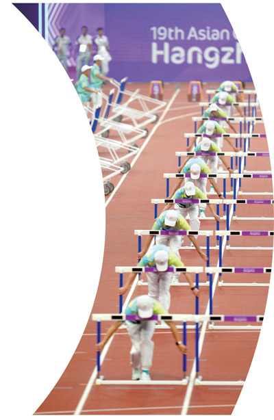 杭州奥体中心体育场内,志愿者在田径项目女子七项全能100米栏比赛前准备场地。 新华社记者 江文耀摄 |
