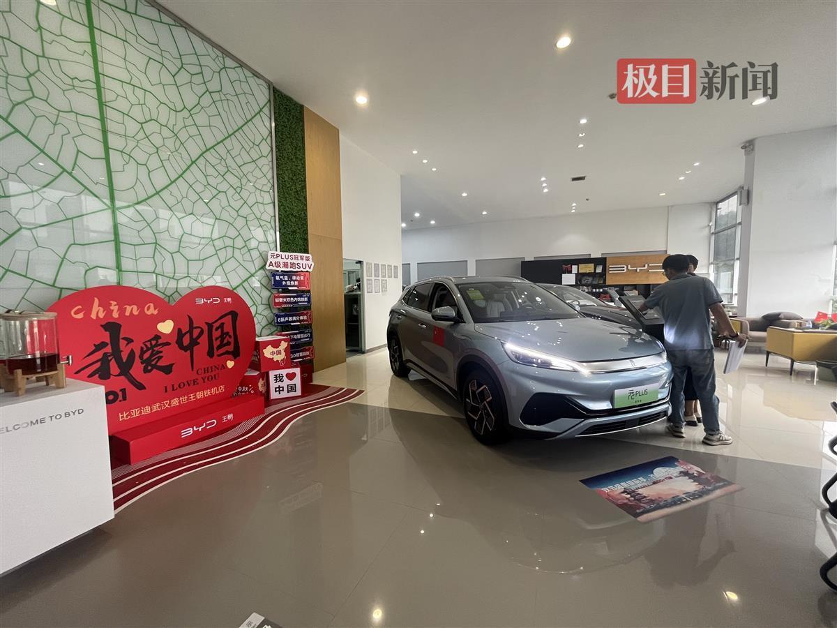 不少没有出游的武汉市民,将长假作为深度“淘车”的好机会。10月2日,在武汉市洪山区的比亚迪盛世王朝铁机城市展厅,极目新闻记者遇到一对年轻情侣,他们表示打算购买一辆13万元左右的纯电车,已经对比了多款车型,此番是想到店咨询元PLUS国庆期间能否有特别优惠。