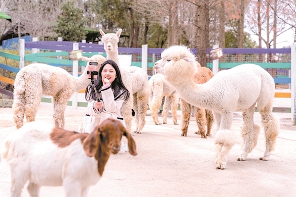 虽然时间尚早,庄园里已有不少游客。阴天并没有影响他们游园的热情,花海中、游乐场旁、动物园里,随处可见拍照打卡的游客。