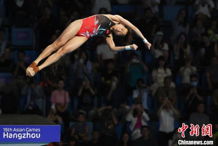 10月3日,杭州第19届亚运会跳水项目女子10米跳台决赛在杭州奥体中心游泳馆举行,中国选手全红婵以438.20的总得分夺冠。 中新社记者 泱波 摄