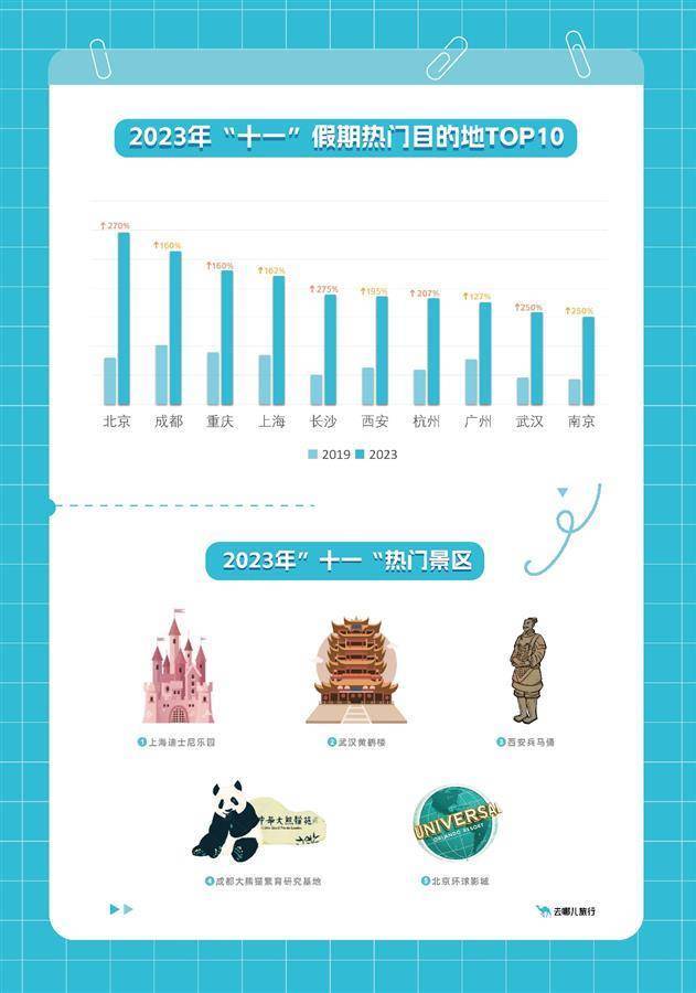 湖北日报讯(记者王理略、通讯员刘婷)国庆假期结束,去哪儿数据显示,“十一”期间国内热门城市机票、酒店、门票等预订量全面超过疫情前。武汉位列全国热门目的地前十,黄鹤楼公园的热度在全国各大景区中排名靠前。