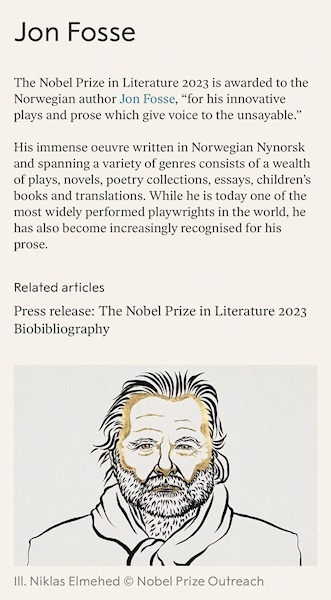10月5日晚7点,2023诺贝尔文学奖揭晓了!挪威作家约恩·福瑟获奖。他写有戏剧作品、小说、诗歌,还有散文作品,他最负盛名的作品是戏剧作品,其戏剧《有人将至》等被搬上世界各地的舞台。